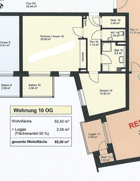 2-Zimmer/65 m²: großes Wohn-/Esszimmer mit offener Küche und Zugang zum Balkon, Schlafzimmer, Duschbad, Gäste-WC, Abstellraum und Flur.
